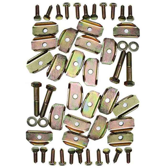 If you’ve removed your body from the floorpan for restoration, you may need this all new hardware kit. The kit includes twenty two 8mm pointed bolts, twenty two stamped reinforced plates, and four 10mm bolts for the pan head area. The 8mm bolts are grade 10.9, and the 10mm bolts are grade 8.8. All bolts are gold zinc plated for long lasting rust resistance.
