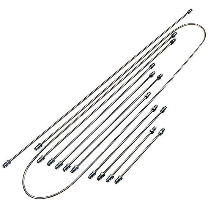 If your’e planning a complete chassis restoration, or just tracking down brake line defects, this kit will solve many problems. The eleven piece kit will replace all the hard lines on your Super Beetle. Works on cars with drum or disc brakes. Hard line tubing is made from non-corrosive stainless steel. End pieces made from zinc plated carbon steel.