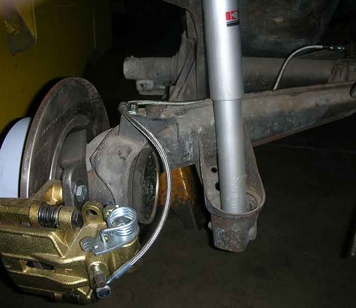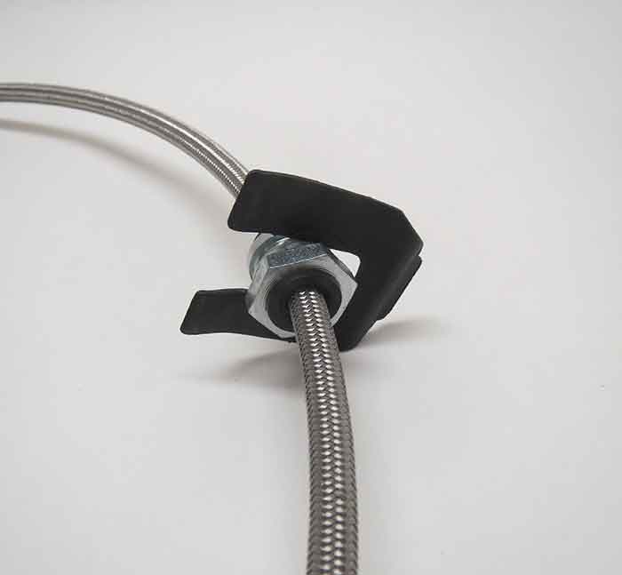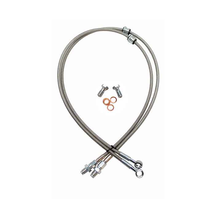 Many of our customers have asked for a better set of brake hoses for our rear disc brake conversion. As many of you know, our kit is based on an Empi rear kit, but edited and improved with different seals, instructions, and hard steel lines. We’ve seen how many of you have improved or improvised a more deluxe solution for these lines. Now we are introducing a super deluxe solution. The lines feature banjo fittings and bolts that work directly on the caliper, presenting a favorable angle to the trailing arm. The line stretches all the way to the brake tee, eliminating the stock rubber brake hose. In the middle of the line is a VW clip friendly sliding steel mount that attaches to the diagonal arm VW mount. Also included are small rubber lined clamps to attach the line near the bump stop area. It’s super neat and complete! Order one today to upgrade your kit!