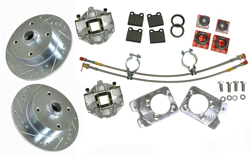 This kit is a great way to get the upgraded look of drilled and slotted rotors at a smaller price tag. Â Calipers are made in China, and the drilling and slotting of the rotors is performed in the USA! Â The kit is installed by removing the drum, brake shoes, and backing plate assembly from the original spindle. (The spindle remains on the car.) The special Beefy Billit 6061-T6 adapters bolt to the spindle to mount the caliper. All the parts supplied with the kit are stock Ghia items (calipers, pads, rotors, grease seals, and bearings) making spare parts easy to find!