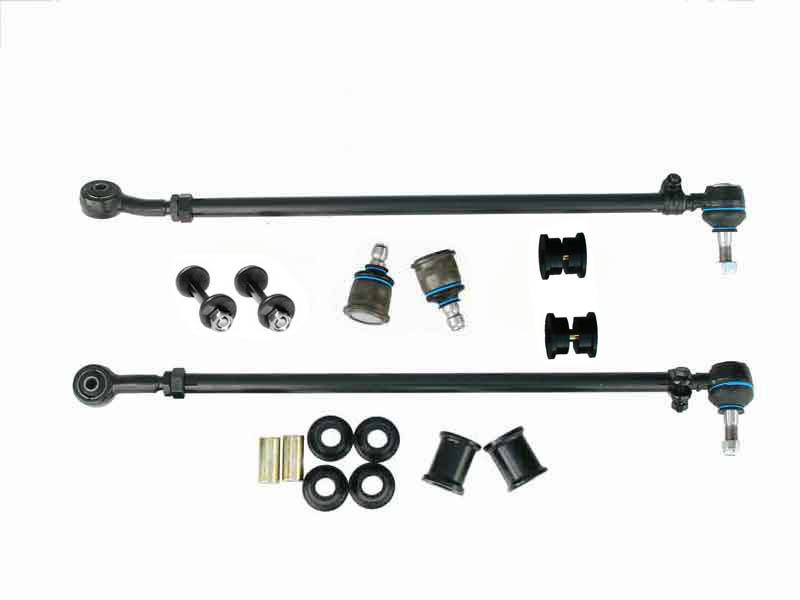 Kit includes right and left tie rods with ends, two ball joints, camber bolts with washers, urethane control arm bushings, and sway bar bushings. **This kit DOES NOT include strut inserts, strut bearing mounts, steering box, steering shaft, brake or wheel bearing items. NOTE ABOUT LOWERED CARS: If your car is lowered even as little as one inch, you should order the “lowered” version of our front end rebuild kits, which includes our Camber+ kit, as well as Caster-Fix bushings for your sway bar. These lowered kits are only a few dollars more than a “standard” kit, but will offer much improved front end alignment results. Sway bar bushings are fro stock 19mm sway bar. If you have an aftermarket 7/8″ sway bars, please notifty us by email or phone call so that we can supply the correct bushings.