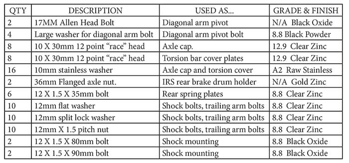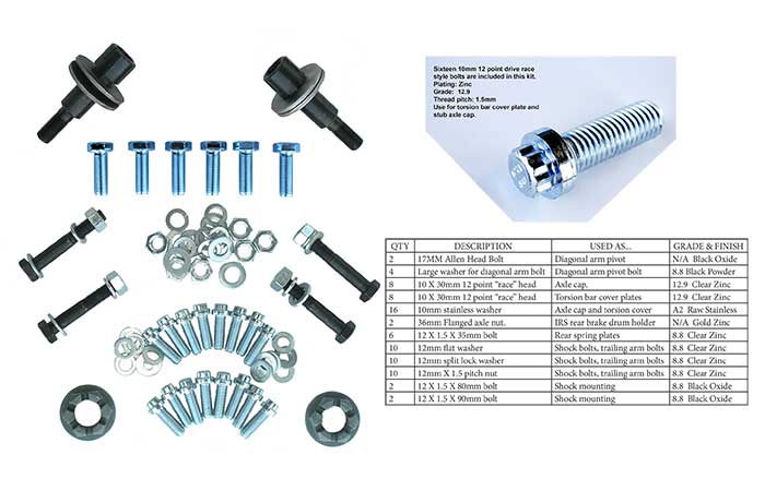 This kit is for the car builder who prefers all new hardware for his project. Many of the bolts are twelve point grade 12.9, and most are zinc plated. (See chart.) Also included are the large allen bolts that secure the diagonal arms to the chassis. You may also order the kit without the big allen bolts for the diagonal arms. Please check the radio button for your selection.