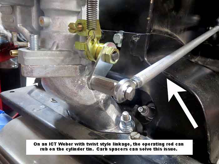 If you’ve installed a twist style linkage from Empi, Scat, or Vintage speed and have interference with the operating rod hitting the cylinder tin, these spacers may solve the issue. The 1/4″ thick spacers are supplied with a pair of 34 ICT gaskets. Zinc plated steel. These spacers could also be used with Type-3 or Type-4 applications where the carbs need a little lift. Made in USA.