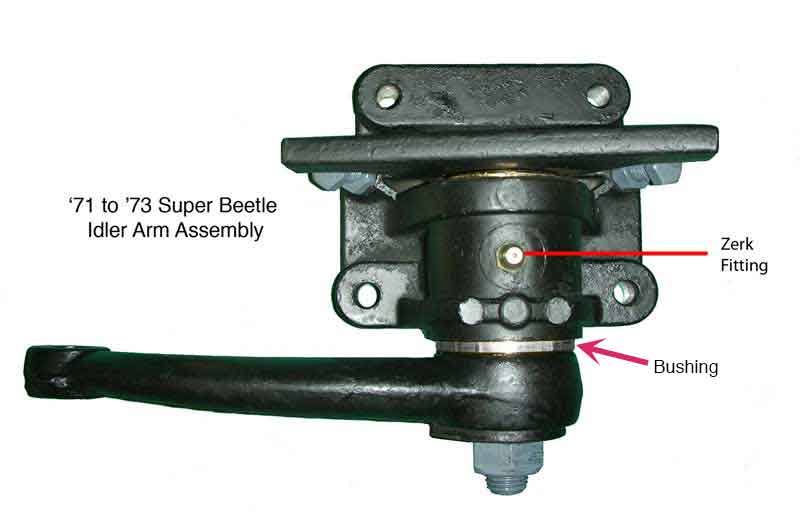 Top Line Parts has introduced a new high performance idler arm bushing for all 71 to mid 72 Super Beetle models. If your Super has been suffering from shimmies and shakes, or sloppy steering, a new idler arm bushing may be needed. The bushing is an exact replacement for the VW bonded rubber bushing, but incorporates some performance improvements. Made from solid T-6 aluminum, the Top Line bushing is plated inside and out with Mil Spec Type 3 anodizing with PTFE lubricant. This bushing will out-last brass bushings. The new Top Line bushing incorporates an internal grease distribution groove. Once pressed into place, it’s an easy matter to drill & tap the holder for a Zerk fitting, making the bushing serviceable with a grease gun. Fits chassis up to VIN #112-25-75326.