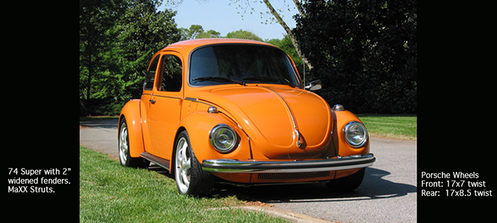 An easy way to get big 7 inch wide wheels and tires under your stock fender! MaXX Struts! Our new coil-over design with small 75mm spring gives maximum wheel and tire clearance for larger 16, 17, and 18 inch wheels. Seven inch wheels should have an ET of from 45 to 55mm for best results. Supplied with adjustable ride height housings, gas GTI shock inserts, springs, billet aluminum spring holders, and closing nut. For 74 to 79 models, this kit lowers from 2 to 4 inches in half inch steps. As an additional benefit, the reduced weight of these struts can lighten your cars weight for racing. This product can be used with 4 lug VW wheels, or with our Porsche (5 on 130mm) studded rotors or drums. We can also custom stud for 5 on 100mm, and 4 on 100mm patterns. Wheel spacers and longer studs are required for many installations…Call for details!