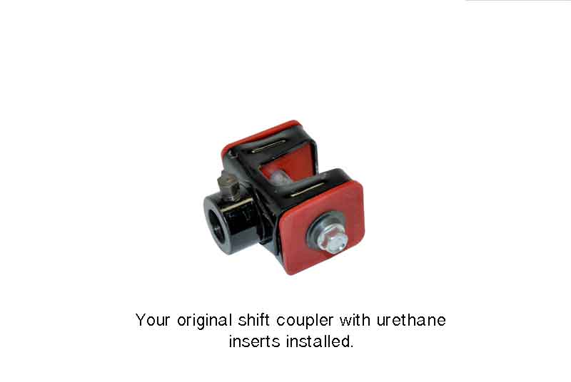 If your shifter rattles, or has trouble selecting gears, you may need to replace the plastic parts that locate the shift rod. In the front, just under the shift lever, a bracket holds a white plastic bushing. At the rear of the rod, there are two plastic bushings that are inserted into the steel shift coupler. This kit replaces the rear plastic pieces with tough urethane. A new square headed securing bolt is also supplied. The bolt is drilled for safety wire. Replacement of these parts requires removing the shift rod from the tunnel. Please consult your repair manual for the procedure.