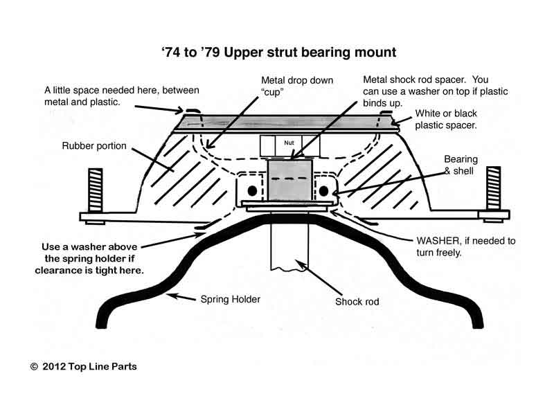 If your assembled strut does not rotate freely from the top bearing, you may need a replacement unit. These imported bearing mounts replace the original units perfectly. We also supply the steel spacer that goes above the bearing. Mount made in China, ball bearing made in Germany. Please note that the drop down metal stamping found at the top of the bearing is not supplied. Please use your original VW part in this location. Sold each.