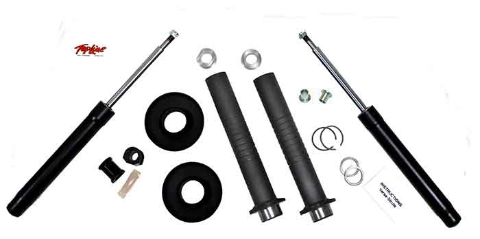 This kit includes our Versa Struts, Caster-Fix Bushings, Flip-It bump steer kit, and strut inserts (shocks). It’s a basic kit with the essentials to lower your 71-73 Super Beetle from 1.5 to 3 inches with good success. Use this kit with your stock springs. For an improvement in ride quality and tire to spring clearance, please also order our Sport+ springs part number 87-0308.