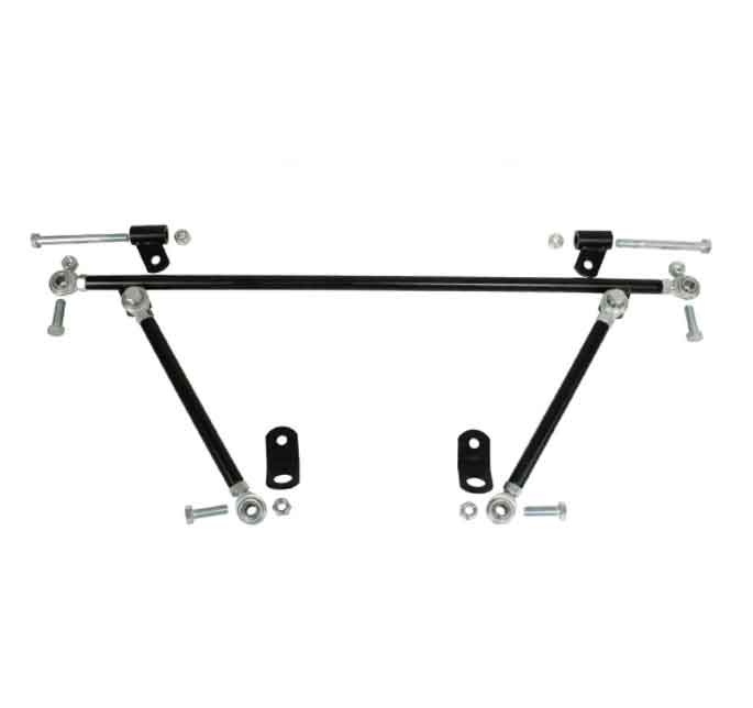This rear truss bar is installed between the upper frame shock towers locking them together for stability. Links going downward from the top bar to the frame horns form a rigid structure that reduces flex and twist to a minimum. Users report a reduction in wheel hop, and improved handling stability. The kit requires drilling a 2″ hole in the fender well near the upper shock mount for clearance of the rod hardware. The lower link tabs are installed between the trans cradle and frame horns. All rods have left and right hand threads, allowing easy length adjustment (similar to adjusting a front end tie rod.) No welding required for installation. Detailed Top Line instructions are provided. Imported from China.