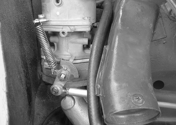 A sturdy “behind the alternator” base plate is included. The aluminum mount fixed to the plate incorporates a return spring. Special “drop through” mounting nuts are included so that there is no need to remove or lengthen the alternator stand studs. Return springs provided for each carb are the same ones used on a stock VWs Solex carburetor. If you’ve lost or damaged a spring, simply borrow one from a spare carb. The feel and return of the throttle action can be fine tuned by using alternate strength springs on the base plate.
