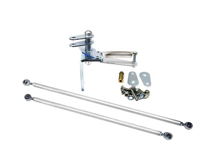The heavy duty steel mounting plate bolts to the block centerline near the bell housing. The throttle cable should not need to be relocated with this linkage. The feel and return of the throttle action can be fine tuned by using either the supplied heavy duty spring, or a stock VW Solex spring (for a lighter feel.)