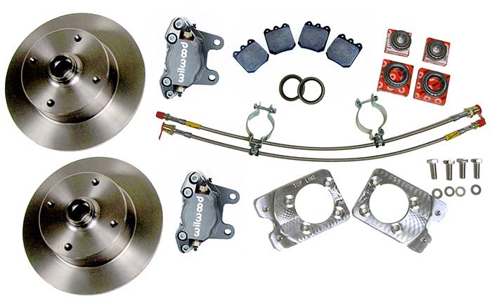 Our popular TRW Ghia based kit now has a nice upgrade. You get all the usual Top Line advantages, including billet adapters, steel braided brake line and clamps, and name brand wheel bearings. These calipers are 2.75 pounds lighter each than the cast steel TRW units, and feature anodized aluminum construction. They bolt on just like a Ghia or Type 3 caliper, so there’s no mystery mounting or alignment issues.